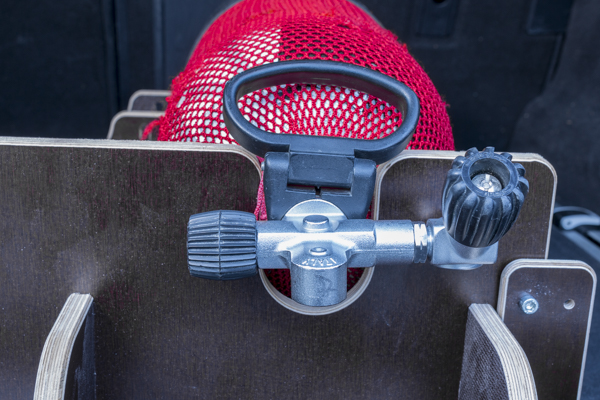 Kein lästiges hin und her Rollen der Tauchflaschen mehr. Kein Verkeilen hinter den Sitzen. Mit unserem "Holder" Bleibt die Tauchflasche da, wo sie hingehört.